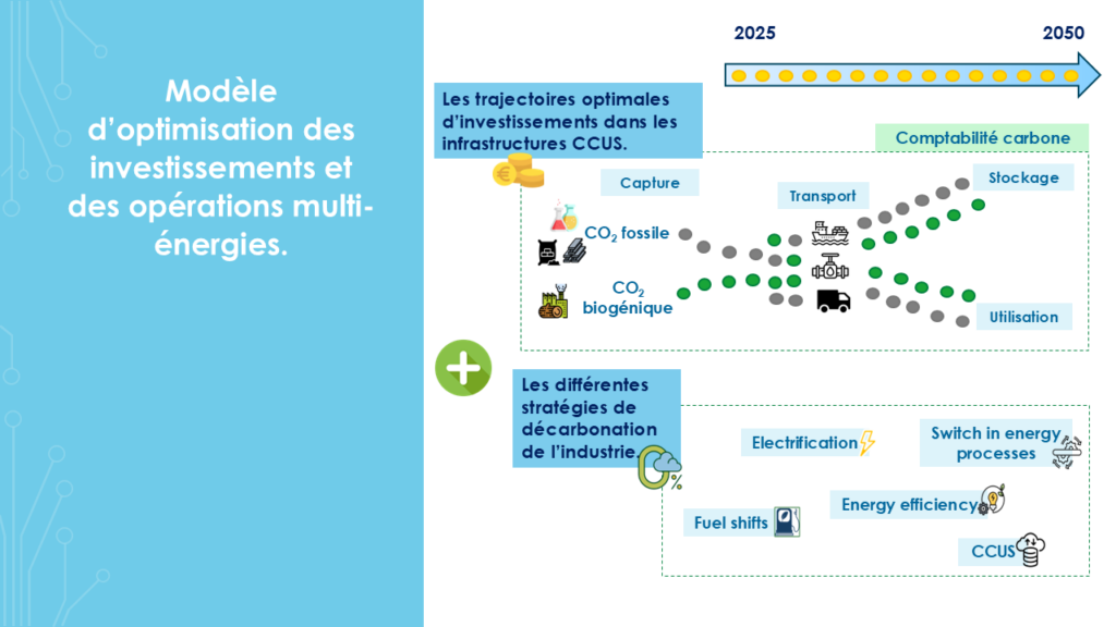 La gestion du CO₂ est devenue un pilier de la transition énergétique, notamment pour décarboner les secteurs industriels difficiles à électrifier. Intégrer captage, transport, stockage et valorisation du carbone dans la planification territoriale reste un défi, en raison de la diversité des sources d’émissions, de leurs interactions avec d’autres vecteurs énergétiques et de la variabilité spatiale et temporelle des flux.